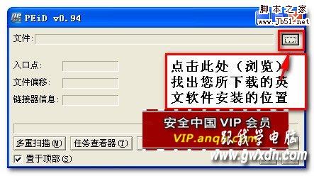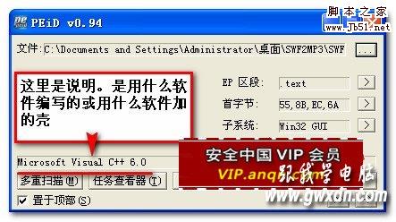 新手想要学汉化。第1步。就是要查壳。看看软件加的是什么壳。什么是壳。壳呢?就象我们人穿的外表的衣服。穿了衣服。我们也就看不到里面的。下面我就用PEID查壳软件来查壳: