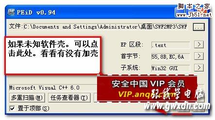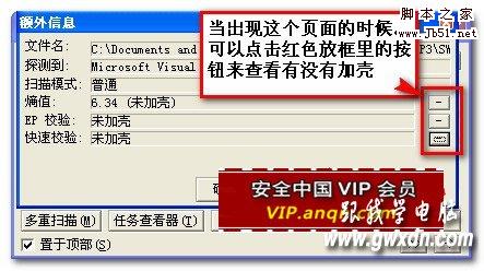 图5:看到了吗?可以点击此处。查看有没有加壳。有些软件没有加壳。但。却无法显示出来。所以呢?我们就要再看一下。如图6: