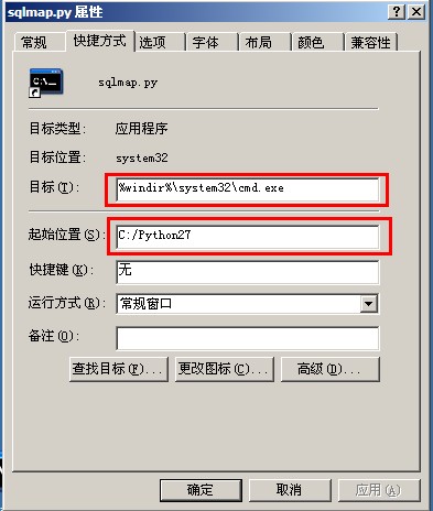 9、点击刚才创建好的Sqlmap快捷方式右键—在目标栏输入:%windir%\system32\cmd.exe