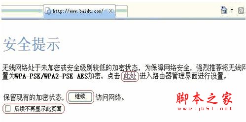 2. 如果无线路由器设置的加密类型为非WPA-PSK/WPA2-PSK AES 加密,您打开网页时会弹出如下界面。