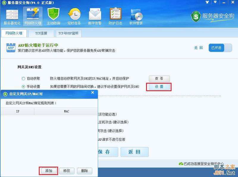 手动设置:如果服务器有多个网关,需要在不同网络间切换,选择手动设置模式。点击“设置”,在弹出的“自定义网关IP/MAC对”对话框进行网关IP与MAC绑定规则配置。“自定义网关IP/MAC对”对话框可以进行添加、修改及删除网关IP与MAC绑定规则。如下图所示: