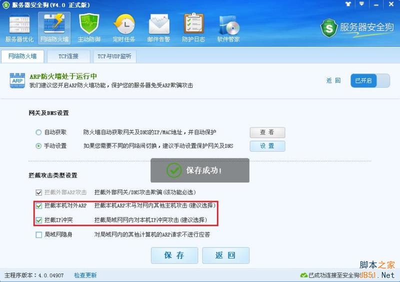 开启“拦截本机对外ARP”与“拦截IP冲突”功能