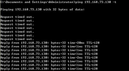 攻击开始后,没过几分钟就可以看到192.168.73.130远程桌面断开,无法ping通。而断开攻击后网络就恢复了。