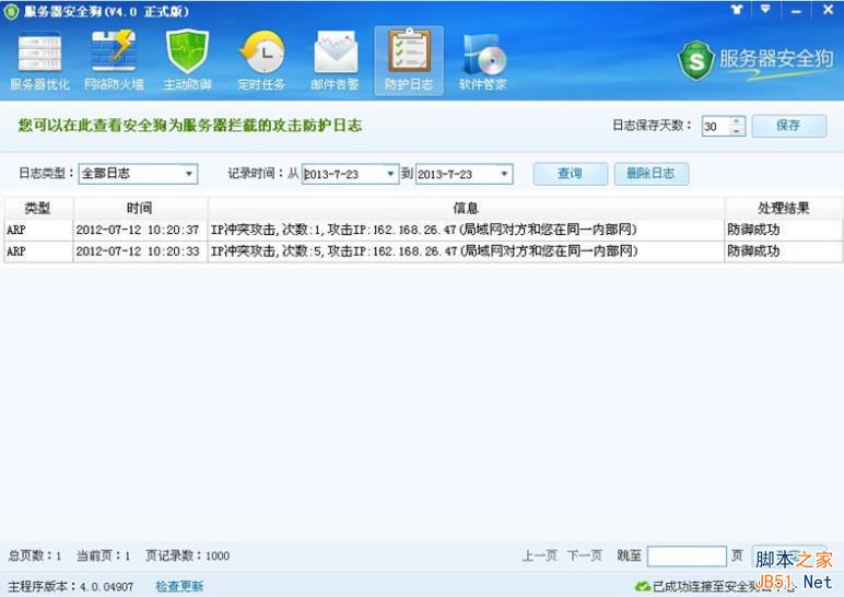 当攻击开始的时候,就可以看到屏幕右下脚的服务器安全狗标志在闪红预警,说明服务器正在遭受攻击。这时候你就可以到服务器安全狗的防护日志里查看日志。如下图: