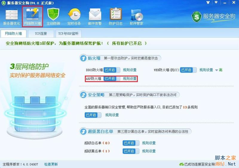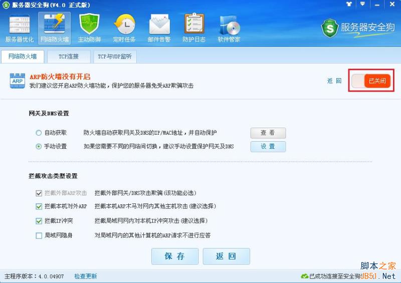这就说明,服务器安全狗已经起作用了,拦截了对方的arp攻击。那服务器安全狗是通过什么模块进行arp攻击防御的呢?这就是服务器安全狗网络防火墙模块中的arp防火墙,对arp攻击起了拦截作用,如下图: