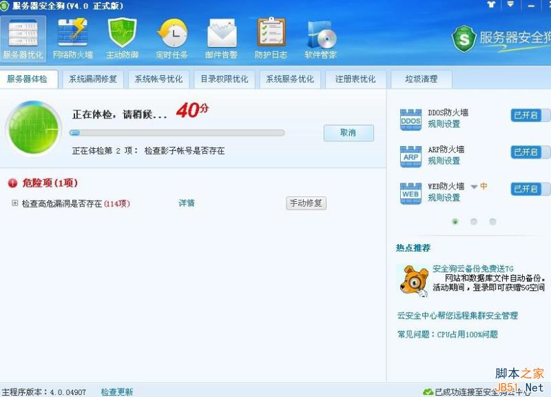 服务器安全狗的服务器体检功能主要是通过检查服务器的各种可能出现的系统漏洞,通过修复相应危险漏洞,帮助服务器有效抵抗外界的攻击,提高服务器的安全管理与服务器的运行稳定性。