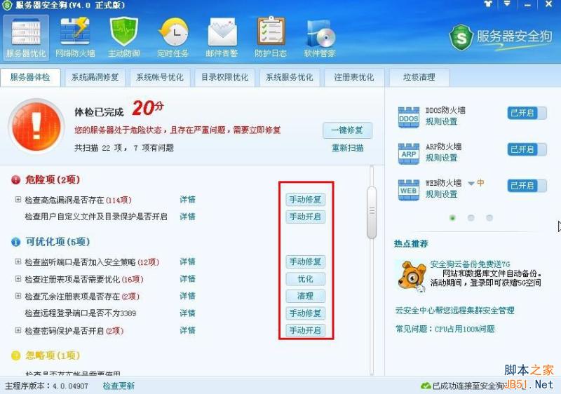 服务器体检完毕之后可以点击“一键修复”按钮对体检过程中发现的漏洞就行修复,系统默认会逐项自动修复危险项,可优化项及安全项三大类选项。