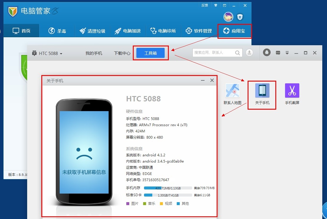 第三步:在电脑管家里面的【应用宝】→【工具箱】→【关于手机】即可查看手机的参数