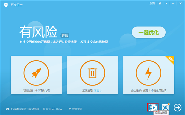 2、安装完成最新的百度卫士视频加速专版,通过下方的快捷功能打开视频加速器。