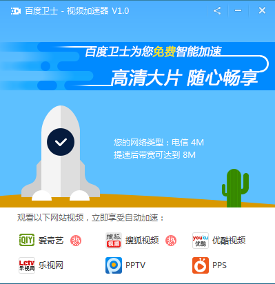 百度卫士视频加速器是一款免费的在线视频加速工具,2M网速最高提速到20M,光纤最高提速到100M!智能自动加速,简单好用!