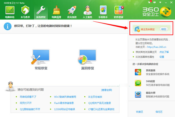 通常我们在安装某些软件时如果电脑上装了360安全卫士的话会经常跳出一个说某某软件正在修改ie主页的窗口提示,我们只要锁定ie主页不让任何软件来修改就能确保电脑不被病毒所侵。下面就来告诉大家360安全卫士怎么锁定主页。