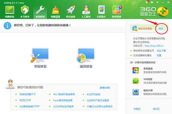 在点击“系统修复”这个标签后,如下图箭头所指之处,你如何没有锁定你的IE主页,那么这里你就看到“IE主页未锁定”这个字样。