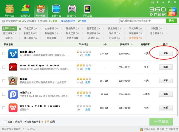 打开360软件管家的软件卸载页面,找到新毒霸悟空并卸载即可