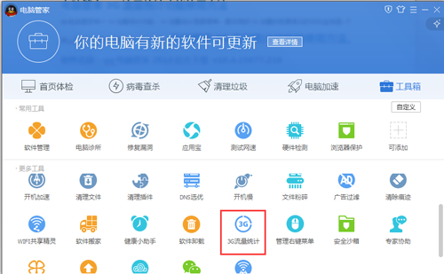 QQ电脑管家有个3G流量统计功能,3G流量统计是最简单,最实用的3G流量的耗费情况的实时监视器。下面小编就给大家介绍一下电脑管家3G流量统计功能的使用方法。