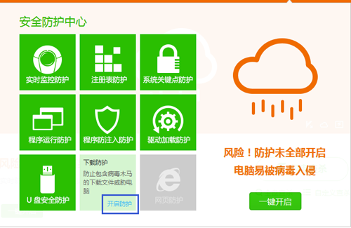 3、点击完成后,会弹出一个对话框,你会看到【下载防护】这个选项,把鼠标移到上面。会自动弹出【开启防护】的按钮。