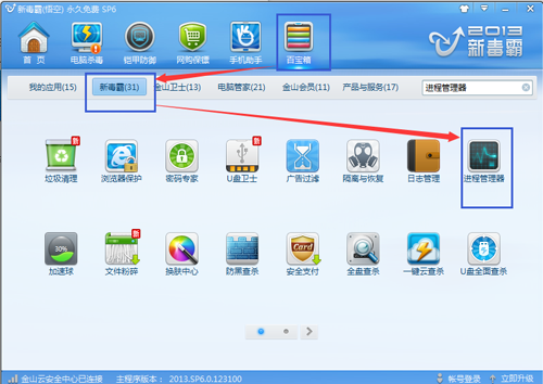 1、在"安全百宝箱"主界面点击"进程管理器"按钮,在左侧的面板中显示了计算机系统中正在运行的所有进程,右侧面板对应了这些进程的相关信息,包括名称,路径等。