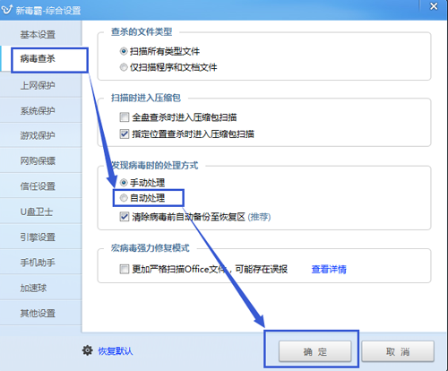 3、在【设置】界面下,点击选择【病毒查杀】-->选择【自动处理】-->【确定】完成操作。如图所示: