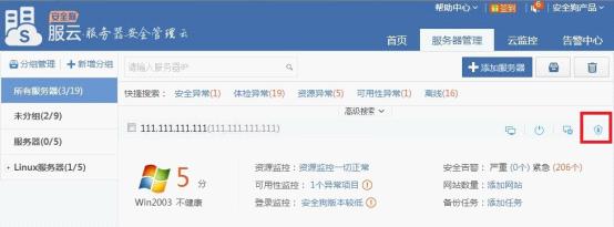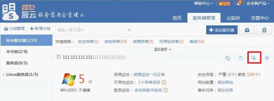 1、“服务器管理”页面上,在需要进行安全狗软件远程操作的服务器条目上,点击安全狗软件远程操作按钮,如图所示: