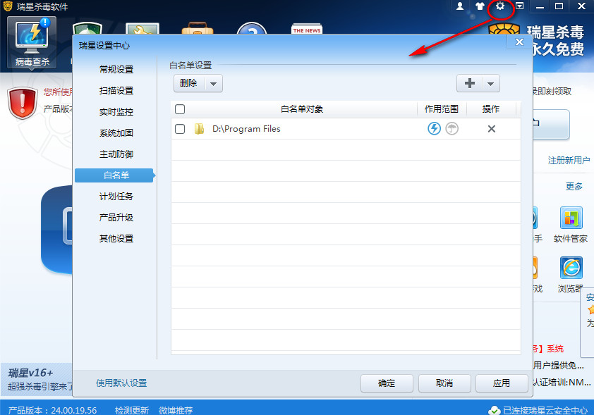 情况1:如果能确认触发API规则的程序是可信的、无毒的且不会对瑞星杀毒软件造成破坏时,可以将此文件加入瑞星主动防御白名单中。当文件被加入主动防御白名单之后,瑞星软件的主动防御功能/自我保护功能将不再对加入的文件进行阻止;