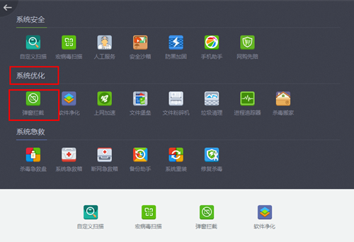 2、在打开的面板中找到“系统优化”功能并在其中找到【弹窗拦截】功能。打开【弹窗拦截】功能。