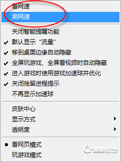 那么在360加速球悬浮窗上右键,就会有如下图,点击测网速