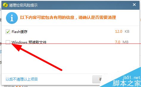 4、弹出清理风险窗口,将不想清理的内容前的√去掉,再点确定