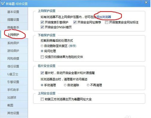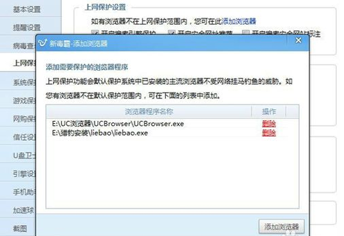 右击金山毒霸的小图标——点设置——点击上网保护——上网保护设置——添加浏览器——找到指定的浏览器的主程序——确定