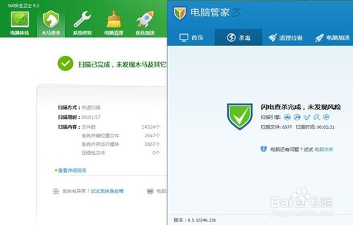 杀毒能力:经本人亲自测试,用腾讯管家检测的一台安全电脑,用360安全卫士却检测出高危风险。虽然我没有实际检测的结果截图,不过看下面这张图就能看出相应的不同。两个软件同一台电脑同一时间点击【电脑体验】,360卫士得出的是有系统垃圾,而腾讯管家却提示要升级的软件。