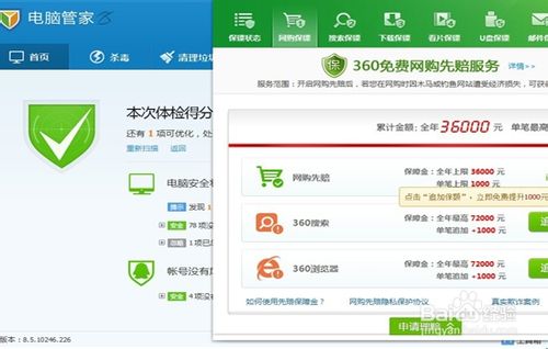 网购保障:相信有过网购的用户都知道,很多杀毒软件都有网购先赔的服务,360也不例外。这是对我们的一种保障,也是对他们的一种肯定。但腾讯管家目前却还没有这项服务,另我们感到十分遗憾。现如今钓鱼网站满天飞,身为一家专业的杀毒软件公司,如果都不能保障我们的网购安全,那简直就是个笑话。