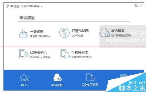 1,打开帐号宝功能后,可以看到有帐号加固、QQ使用记录和安全支付几个功能,我们要找的是帐号加固这个选项