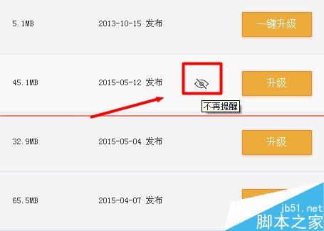 3、如果不想看到某一个软件的升级提醒,可以将鼠标移动到“升级”图标的左侧空白处,会自动出现“不再提醒”图标,点击之后,该软件不会在升级提醒中出现。