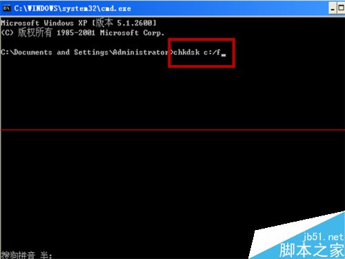 4、进入到cmd命令之后,我们在弹出的界面中输入chkdsk c:/f这一指令,输入完毕之后我们点击回车。