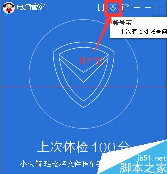 2、启动电脑管家,在其右上角打开“账号宝”。与QQ打开的账号宝是一样的,所以选择其一打开就可以。