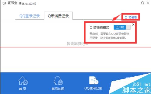 5、点击“QQ登陆记录”和“Q币消费记录”进行切换查看。因为小编没有使用过Q币所以,Q币消费记录为空,若您消费了,则在下方会显示出每一笔消费记录的。