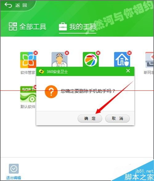 4、如果在手机助手上点击它右上角的红色叉叉,它就会弹出一个面板,提示您确定要删除手机助手吗?我们选择确定。当然处在编辑状态的时候,它也是可以进行多个选择。选择好之后退出编辑。
