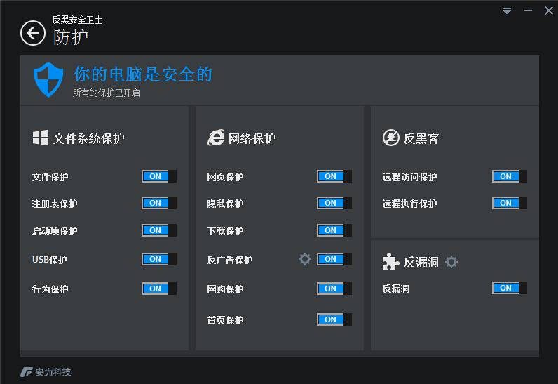 反黑安全卫士2015的保护功能,能够为用户提供文件系统保护、网络保护、反黑客、反漏洞的智能保护,让用户能够更加畅快无忧得使用互联网带给人们的精彩体验。