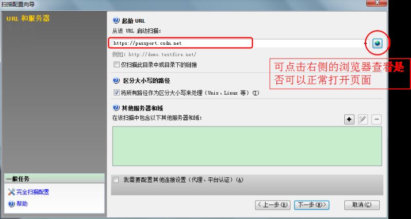三、点击”下一步“,出现URL和服务器的配置页面,如图,输入需要测试的URL。