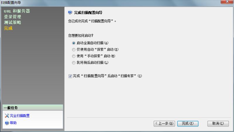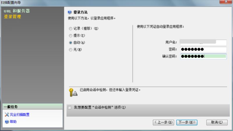 这里选择使用的登录方法是自动,即需要输入用户名和密码。如果选择的是记录,则需要对登录过程进行录入,在录入的过程中,appscan可以记住一些url,方便进行扫描。