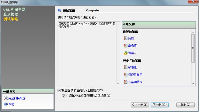 五、点击”下一步“,出现测试策略的页面,可以根据不同的测试需求进行选择,这里选择的是”完成(Complete)“,即进行全面的测试,