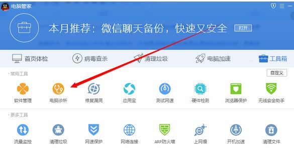 下载安装后,打开腾讯电脑管家,在工具箱内找到“电脑诊所”功能。如图1所示
