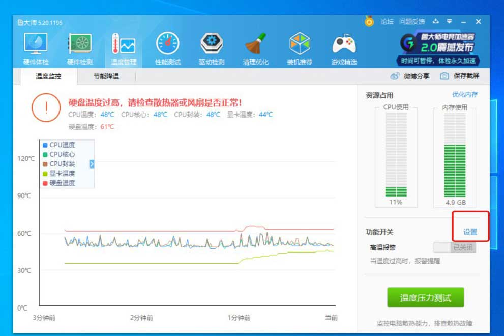 5、关闭设置页面,鲁大师自动打开“高温报警”功能。