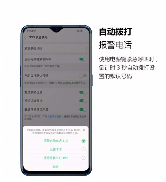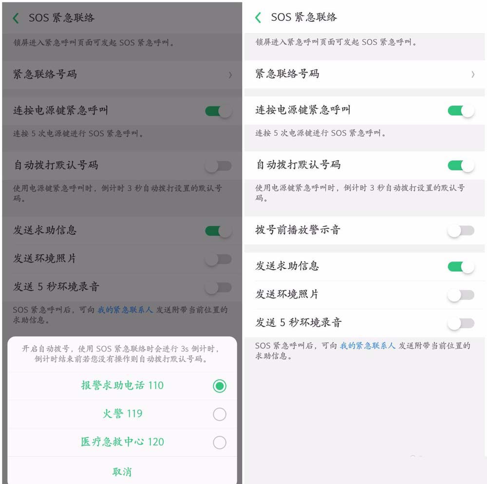 路径:设置--安全--SOS紧急联络--自动拨打默认号码--选择110/119/120即可。