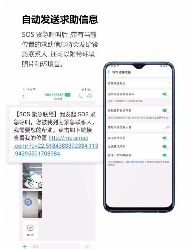 SOS紧急呼叫后,带有当前位置的求助信息将会发给紧急联系人,还可以附带环境照片和环境音