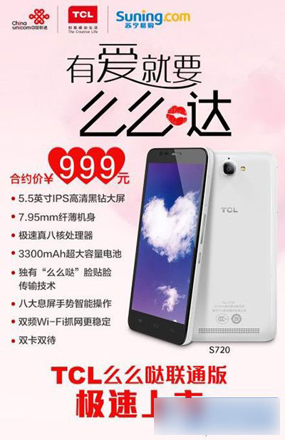前段时间,TCL推出了一款名为“么么哒”的八核智能手机,凭借不俗的配置和778元的价格获得了不少的关注。现如今,继移动版之后,联通版“么么哒”即将发布,合约价仅为999元。