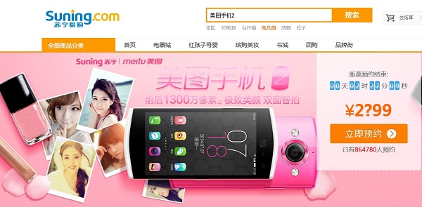 首先登陆苏宁易购网站,然后在顶部搜索框中,输入“美图手机2”搜索一下就可以找到预约界面了,然后点击预约,如下图所示:
