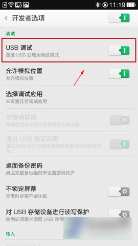 3)点击“开发者选项”,把USB调试开启就可以了。(如下图所示)