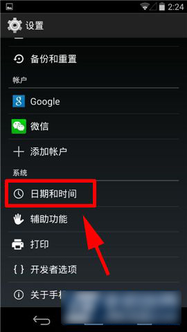 1)首先,进入手机“设置”,然后在“设置”菜单里找到并点击进入“日期与时间”。(如下图)