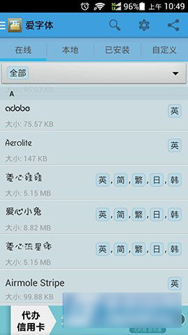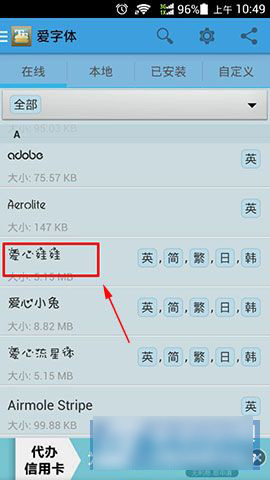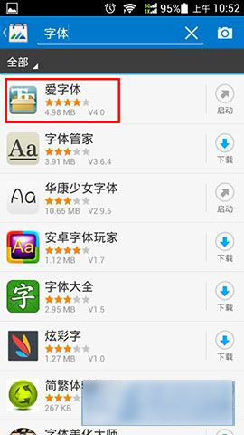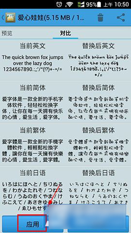 2)在“爱字体”中我们可以看到很类型的字体,选择一款自己喜欢的字体,点击下载,下载完成之后点击左下角的“应用”,设置完成之后,重启手机就可以了。(如下图所示)
