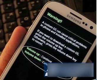 2)进入到三星i9300刷机模式后,我们可以看到手机中出现了不少英文提示,其大意为:第三方操作系统可能会导致手机和已经安装的程序发生严重性错误,如果要继续,请按音量向上键,否则请按音量下键取消。