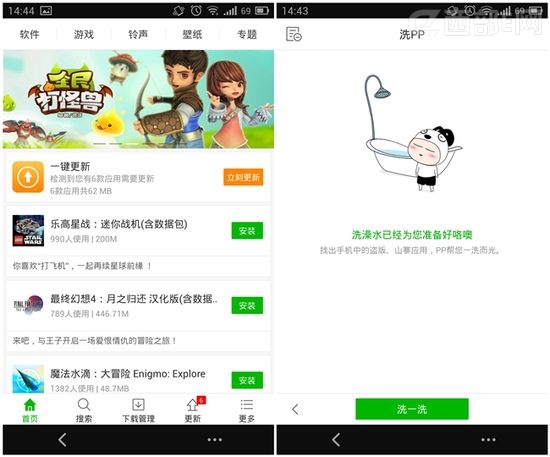 此外,对于手机上以前就有的应用,可以通过手机端的PP助手安卓版“洗PP”功能检测一下,帮你揪出那些隐藏身份的盗版、山寨应用,还手机一个绿色干净的环境。